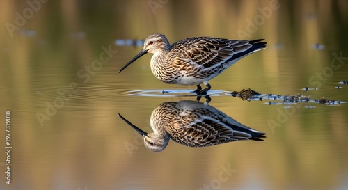 Shorebird with long beak reflected in calm water, standing in shallow pond with ripples.
