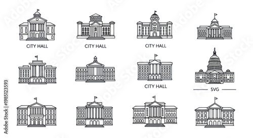 City Hall Building Icons Collection: Government Architecture Line Art Set