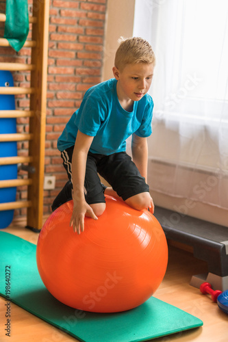 Kind bei der Kinderphysiotherapie hält kniend, ohne sich festzuhalten, Balance auf einem Gymnastikball