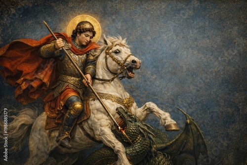 Saint George slaying the dragon on a rearing white horse in sacred icon art, Orthodox religious icon with copy space