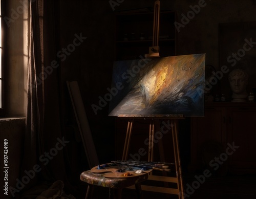 Wnętrze pracowni, sztaluga z obrazem w połowie ukończonym. Celowe, dramatyczne oświetlenie (chiaroscuro), skupienie na grze światłocienia na płótnie.