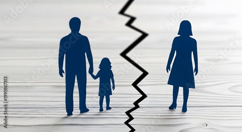 Conceptual image of a family split by a jagged line, symbolizing divorce and child custody issues.