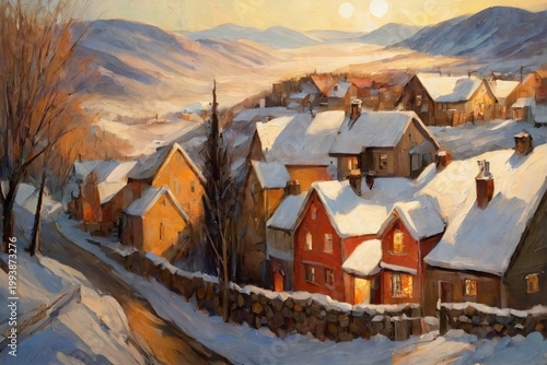 A serene winter village at dusk with snow-covered cottages glowing