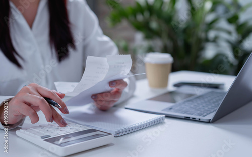 Businesswoman using calculator for tax and financial management, invoice and money accounting, budgeting, expense tracking and business finance concept.