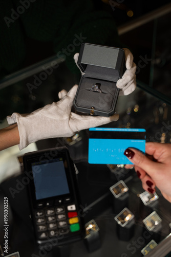Bride holding payment card while buying engagement ring in store.