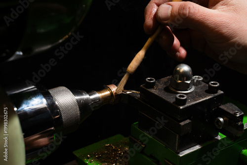 Jeweler applies cutting fluid with a brush before milling a ring on a precision machine.
