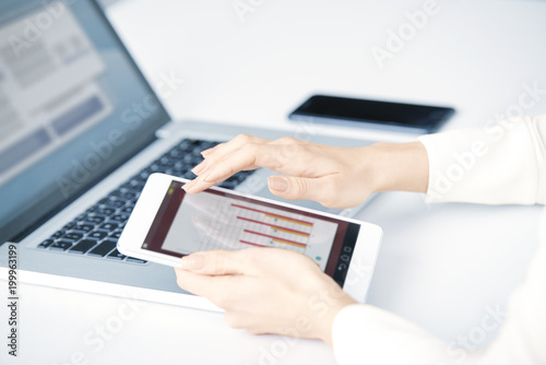 Close-up of businesswoman's hand touching digital tablet and analyzing financial data while sitting in front of laptop at office desk and working on new business report. Isolated on white background.