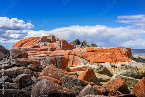 Beautiful sunny summer coast view from Bay Of Fires to blue Tasman Sea with crystal clear water surrounded by red orange colorful shore rocks and white sandy beach, Cosy Corner, Tasmania, Australia
