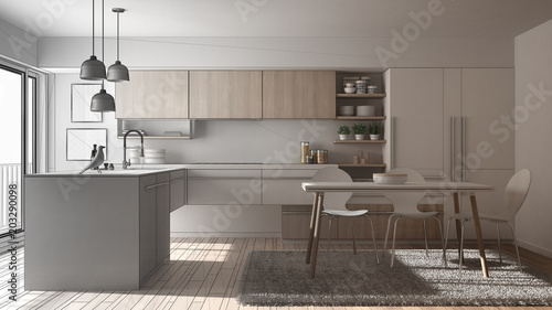 Unfinished project of modern minimalistic kitchen with dining table, carpet and panoramic window, architecture interior design