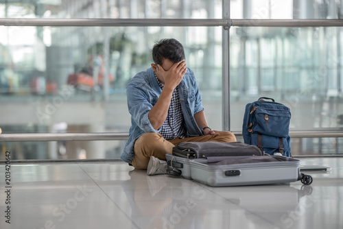 Traveller man in casual clothes sitting behind his unpack luggage and use hand touch head with unhappy because passport lost at the terminal airport.