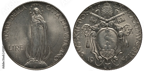 Vatican City coin one lira 1941, Virgin Mary standing, papal arms, keys, tiara, shield with dove,