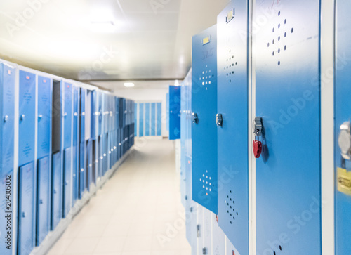 Blaue Spinde und Vorhängeschloss in der Schule, Umkleide