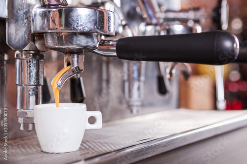 Close up of traditional Espresso Coffee Machine making cup of espresso coffee.