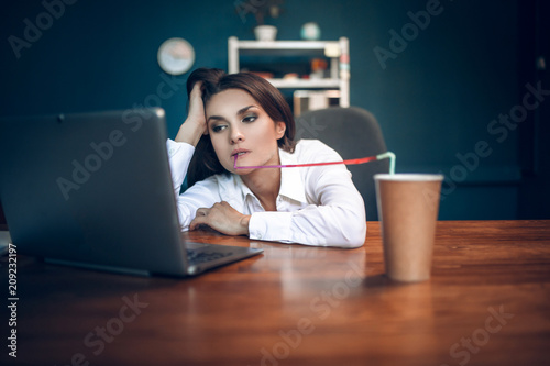 Beautiful lady tired of working in office. Exhausted business lady sitting at office table and having drink with coloured straw from disposable brown cup with her head in her hands.