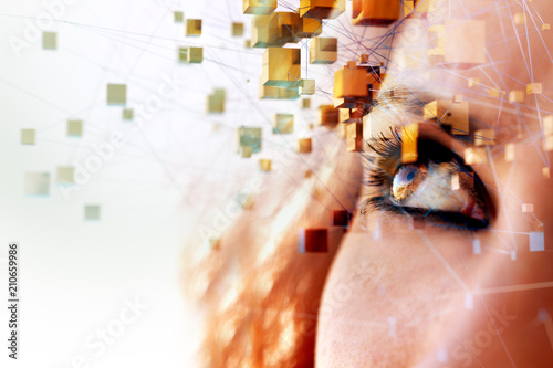 Fondo futurista del concepto de ciencia y tecnología. Cara de mujer y cubos conectados Diseño de socios y redes. Internet y comunicación de datos
