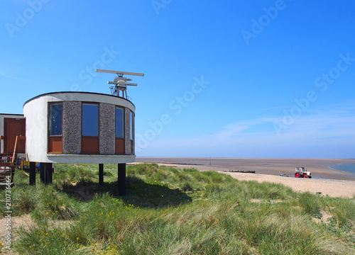the old coastguard station in fleetwood with radar antennae with crass covered dunes leading to the beach on a summers day in bright sunlight with blue sky