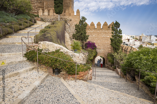 the entrance gate of the Alcazaba (castle) and a view over Almería city, Andalusia, Spain