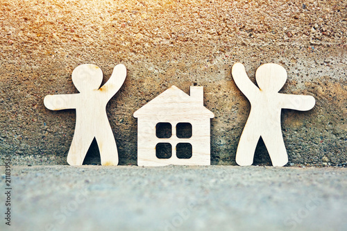 little wooden men and house on natural background. Symbol of construction, family, sweet home concept