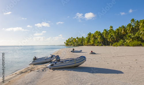 reef ring, lagoon and motu with palm trees on Makemo Atoll, Tuamotus archipelago, French Polynesia, France,