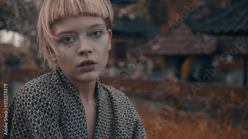 Portrait of beautiful fashion girl in kimono posing outdoor near traditional Balinese temple. Portrait of stylish hipster female outdoor
