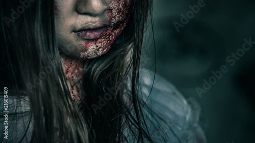 Close-up portrait of a horrible scary zombie woman.