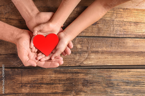 Family holding small red heart in hands on wooden background