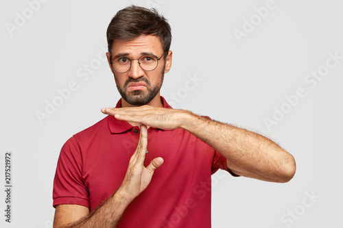 Photo of displeased bearded male keeps hands perpendicularly, has uncertain expression, tries to explain route or direction, wears round spectacles and red t shirt, isolated over white background