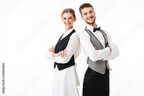 Young smiling waiter and waitress in white shirts and vests sstanding back to back while joyfully looking in camera with arms folded over white background