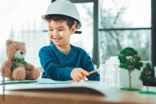 My friend. Delighted boy keeping smile on his face while turning head to his bear toy