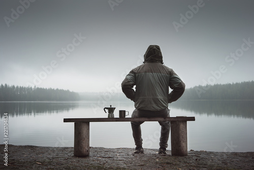 A man is sitting on a bench and looking at the lake. Back view. Also a coffee maker and a mug on the bench.