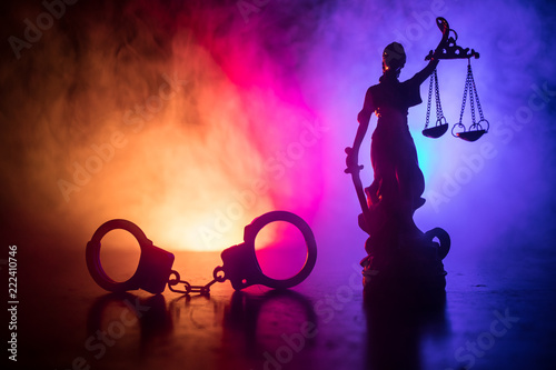 Legal law concept. Silhouette of handcuffs with The Statue of Justice on backside with the flashing red and blue police lights at foggy background.