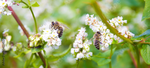 Bees working of common buckwheat. Collecting nectar for honey from cultivated flower fagopyrum esculentum.