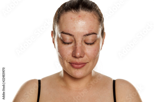 beautiful middle-aged woman without makeup on white background with closed eyes