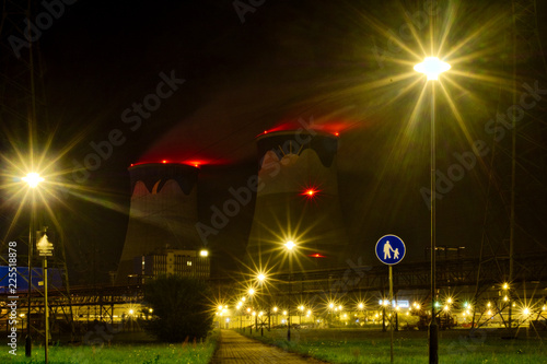 Nocny widok na oświetlone chłodnie elektrowni