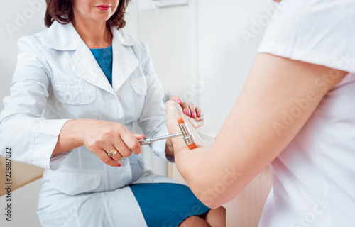 Neurological examination. The neurologist testing reflexes on a female patient using a hammer.
