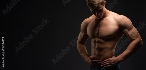 Bodybuilding concept. Strong bodybuilder sports fitness man after bodybuilding training, copy space. person. Strength and Motivation. Banner