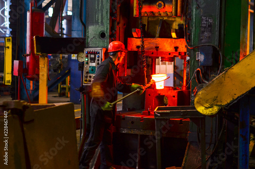 Hot iron in smeltery held by a worker. High precision hot forging product, automotive part production by hot forging process, automatice line hot forging. iron melting recycling work.
