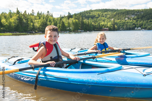 Summer vacation Portrait of cute boy and girl kayaking the on river