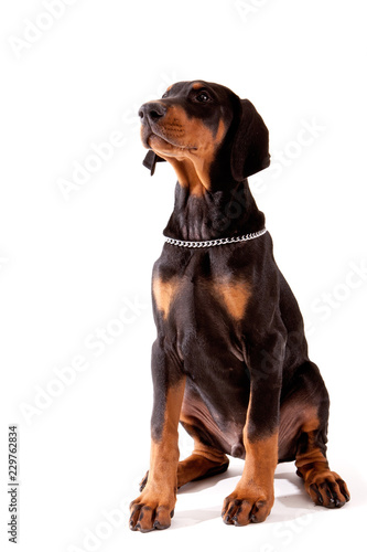 Five month old sitting Dobermann Puppy, looking slightly up begging