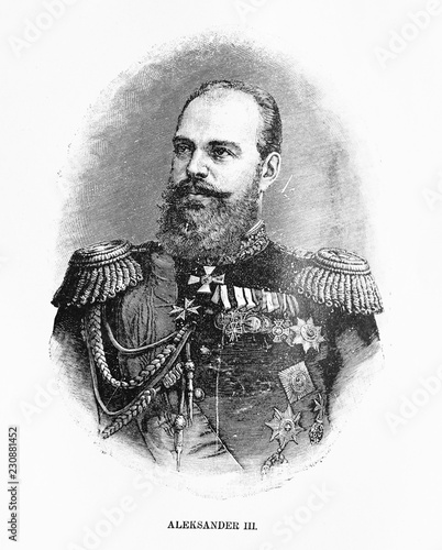 An engraved illustration of portrait of Russian King Alexander III from a vintage book Encyklopedya Powszechna, 1890, Warsaw