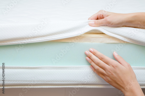Woman's hands touching different layers of new mattress. Checking hardness and softness. Choice of the best type and quality. Front view. Close up.