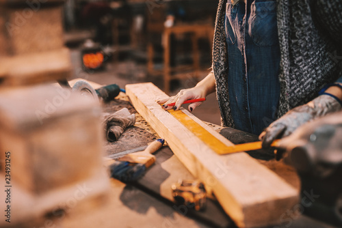 Close up of female carpenter working in workshop. Female doing male's work concept.