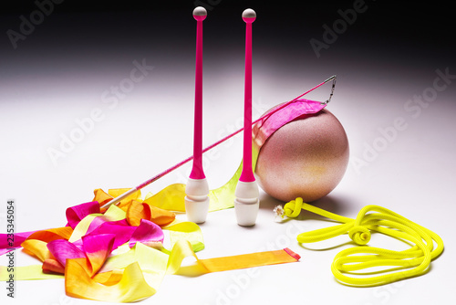 Accessories for rhythmic gymnastics ball, clubs, ribbon, rope lie on the floor.