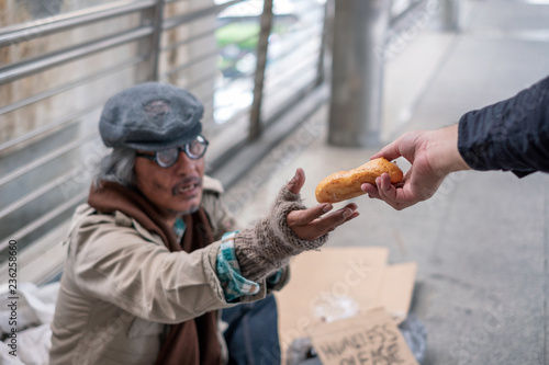 Old man homeless reach out to get bread from donor