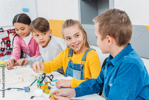 smiling preteen schoolchildren making electric robot with details in stem education class