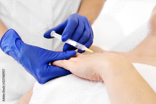 Mezoterapia igłowa dłoni. Kosmetyczka wstrzykuje koktajl witaminowy pod skórę dłoni kobiety. Odmładzający zabieg kosmetyczny.