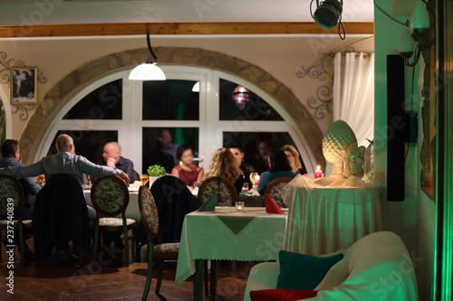 Ludzie na przyjęciu w restauracji, pięknie zaprojektowany wystrój wnętrza.