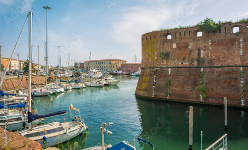 View of the Fortezza Vecchia, an Old Fortress with a tower located in Livorno, on an area that many call “piccolo Venezia”, or little Venice, Tuscany, Italy