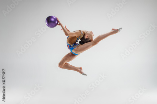 The teen female little girl doing gymnastics exercises with ball on a gray studio background. The gymnastic, stretch, fitness, lifestyle, training, sport concept