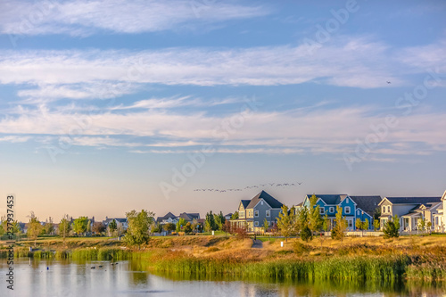 Flock of birds in the cloudy sky over Oquirrh Lake